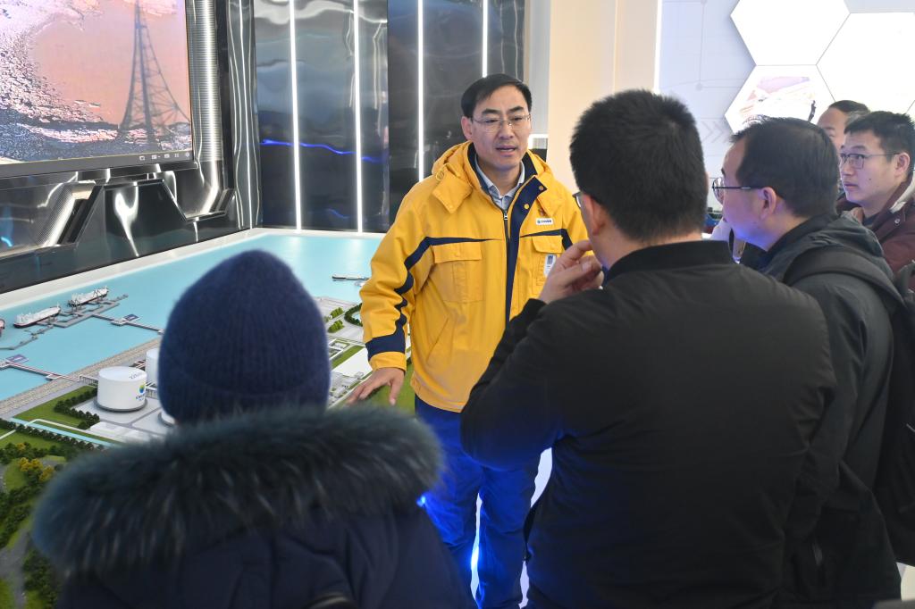 在工程部技术负责人刘建锋的引导下教工党员们走进新奥燃气展厅近距离观摩约1000亩的行业发展沙盘与“新奥普陀号”模型,直观感受液化天然气储存运输技术革新与绿色能源转型布局,随后全体成员接受系统安全教育培训并穿戴安全作业设备一同来到液化天然气罐区与接卸码头,深入学习燃气行业安全操作规范与应急处置流程。