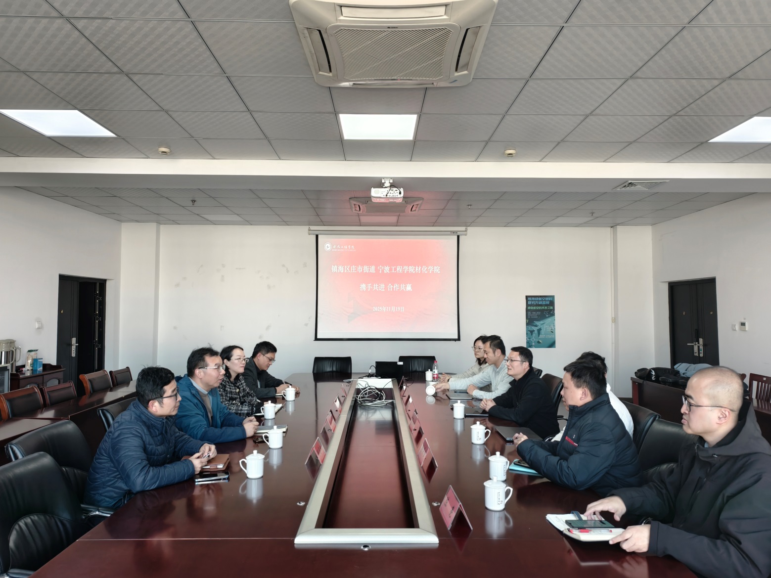2025年11月19日,镇海区庄市街道办事处副主任童晓军率六人代表团莅临材料与化学工程学院访问交流。随行人员包括万有引力(宁波)电子科技有限公司、北京中科优辰星宇科技有限公司、宁波甬研社科技产业发展有限公司及街道相关部门负责人。学院党委书记史玉立、副书记蒋洵,化学工程系周国权教授、材料系副主任李磊教授共同接待并参与交流。