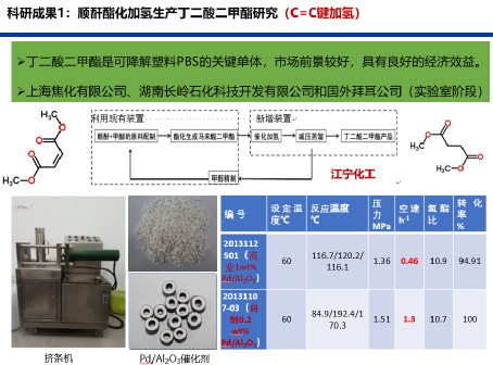 主持研制的蛋壳型Pd催化剂(球型、三叶草型和拉西环型),在200毫升固定床装置上,连续高空速下运行100小时,丁二酸二甲酯选择性保持98%以上,顺丁二酸二甲酯转化率为100 %,未见明显失活,展现优异稳定性。