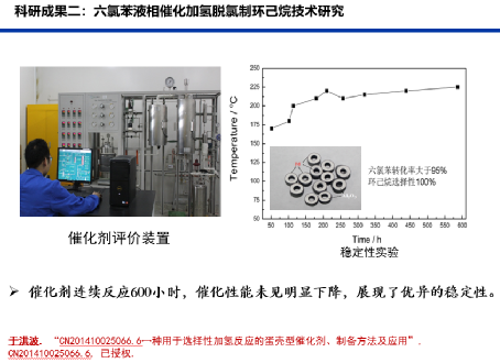 主持研制的蛋壳型Pd@Al2O3/C催化剂(球型、三叶草型和拉西环型)在六氯苯加氢脱氯制环己烷/苯反应中连续稳定运行500 h(200毫升催化剂装填量),展现了优异的应用前景。
